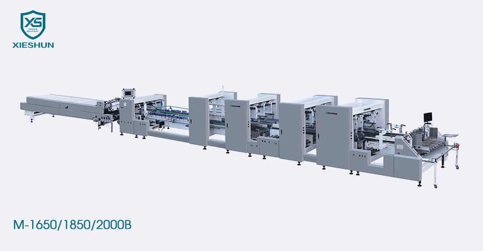 Čína Xieshun M-1650/1850/2000B Automatická těžká těžká složka spodního zámku Gluer, používat PLC a importované elektronické komponenty, podavač s nezávislým servomotorem se pohybuje pomocí lineárních průvodců, aby byla zajištěna přesnost a snadnost provozu.